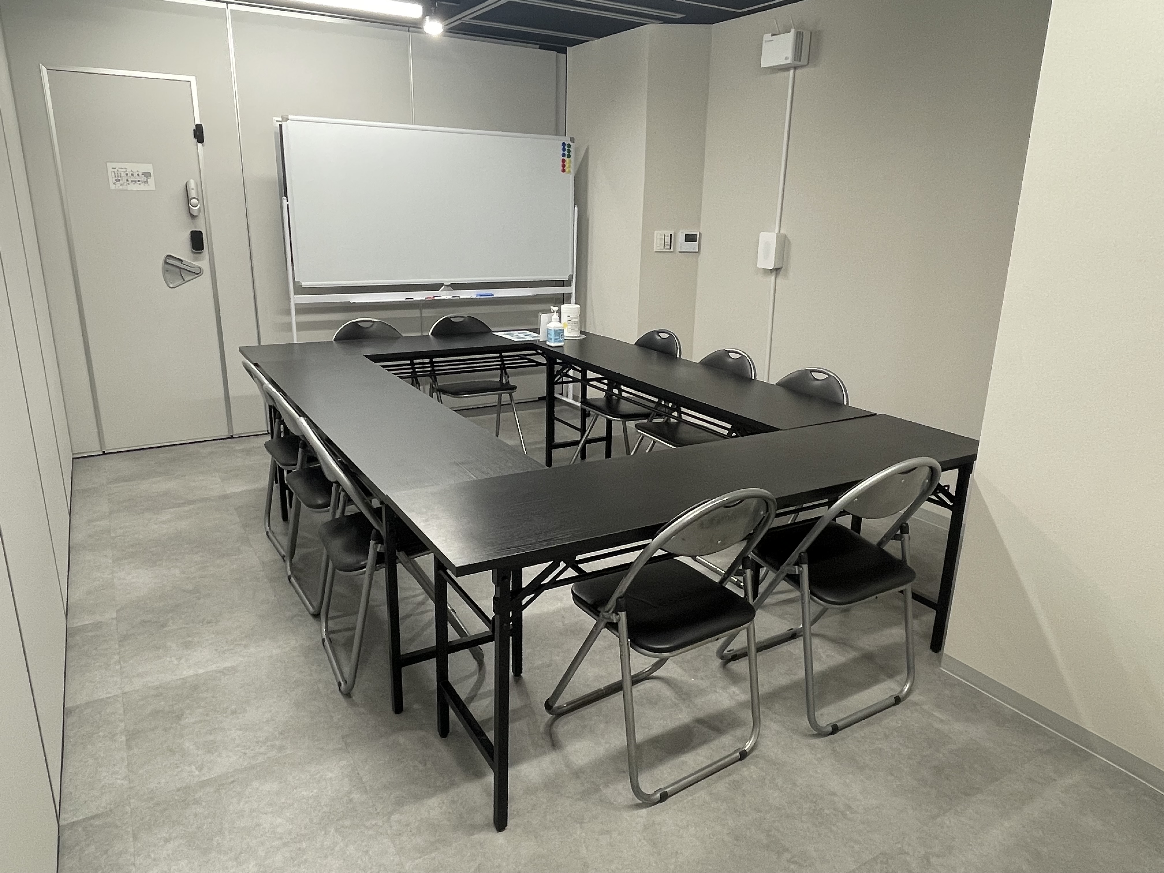 長机3個、椅子8個、ホワイトボード設置。予備椅子あり。