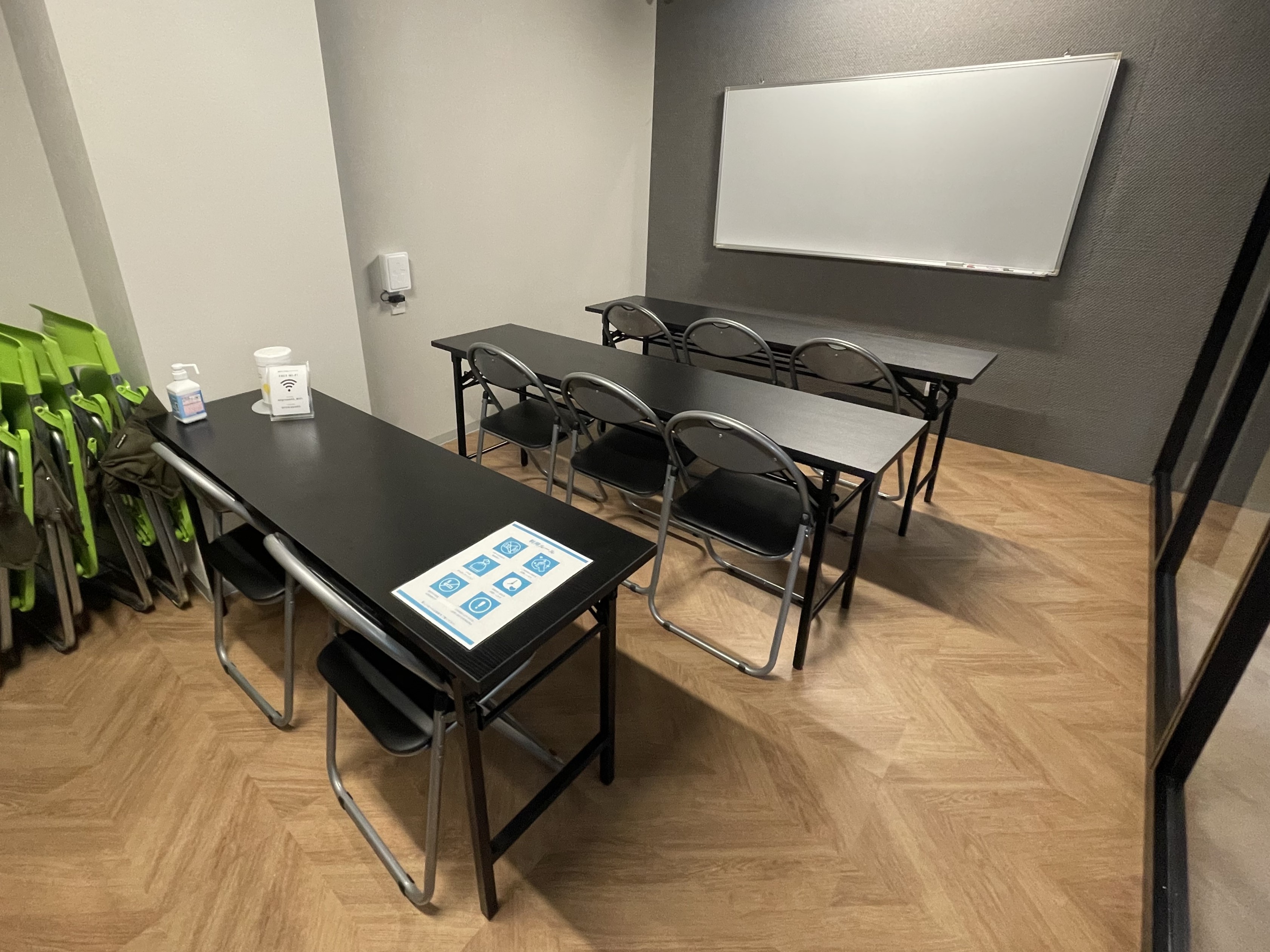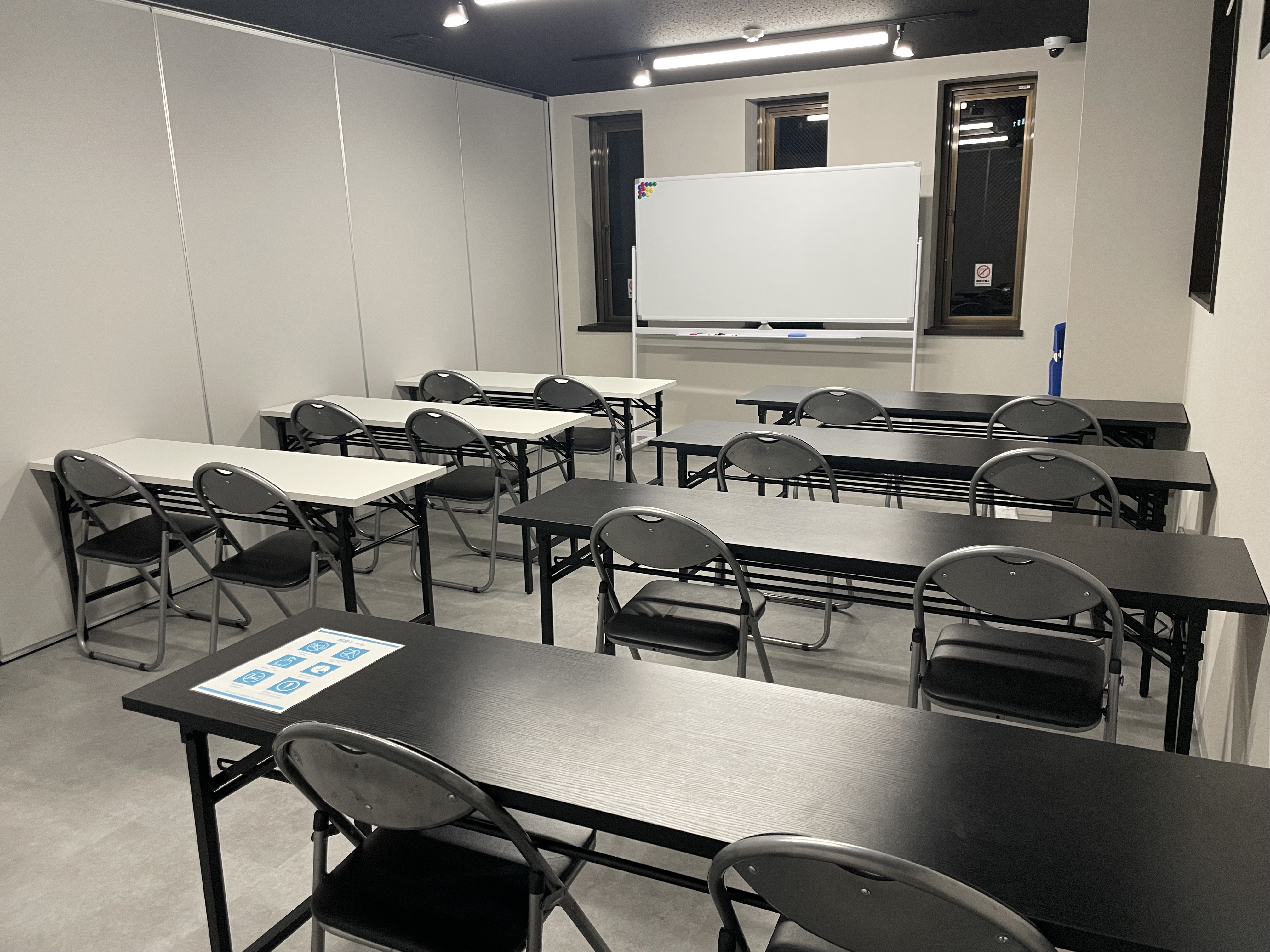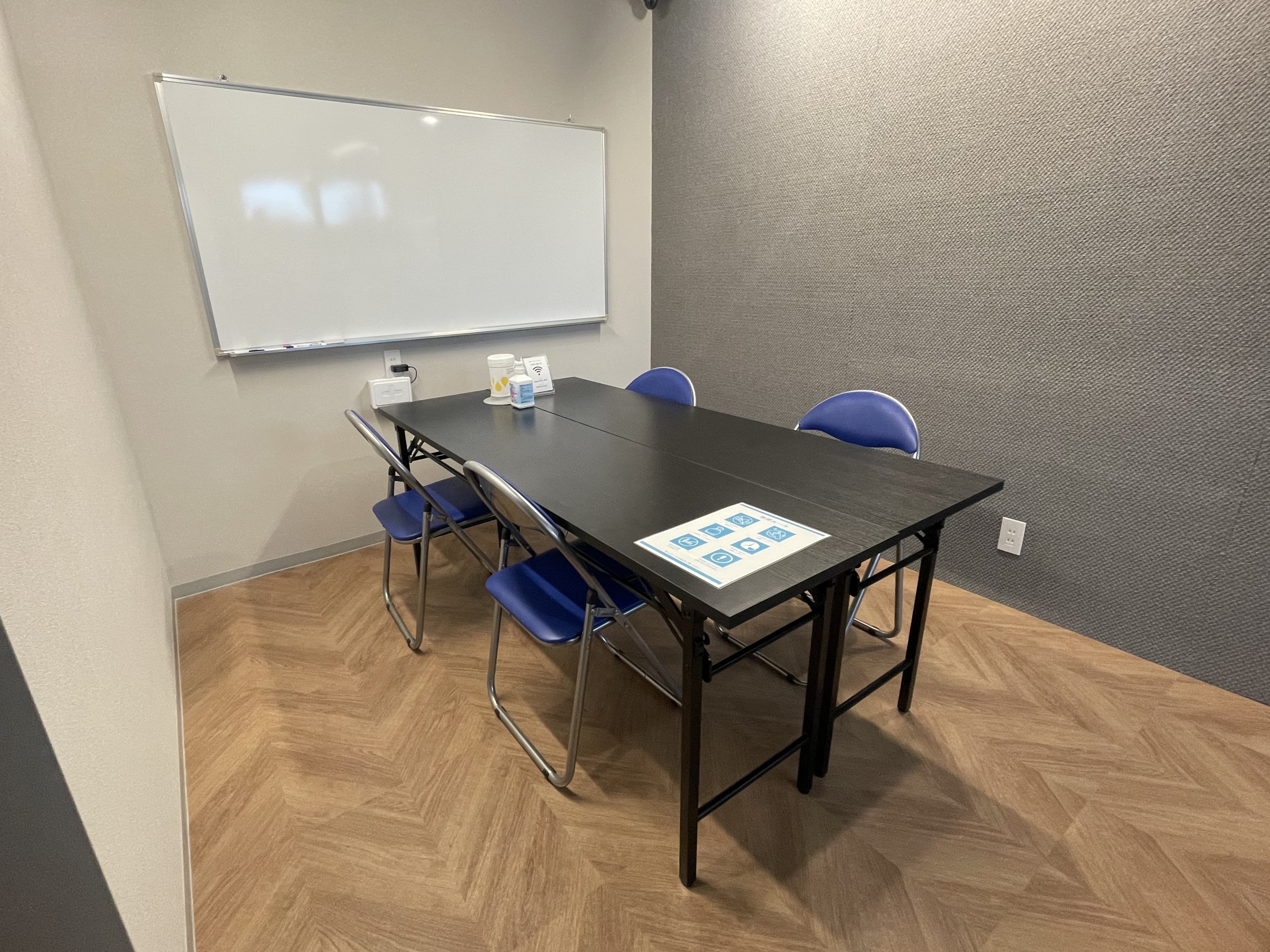 長机2個、椅子4個、ホワイトボード設置。予備椅子あり。