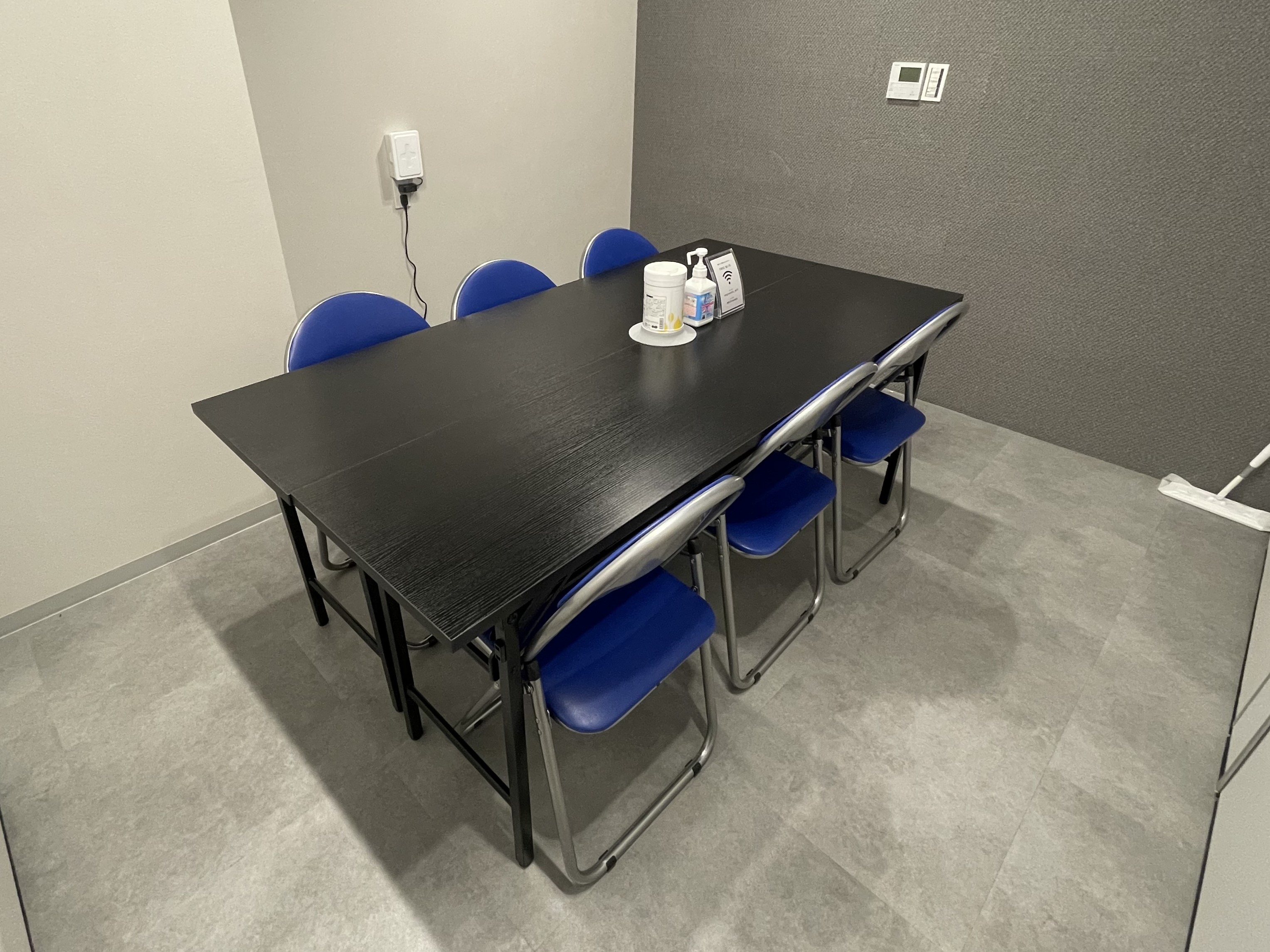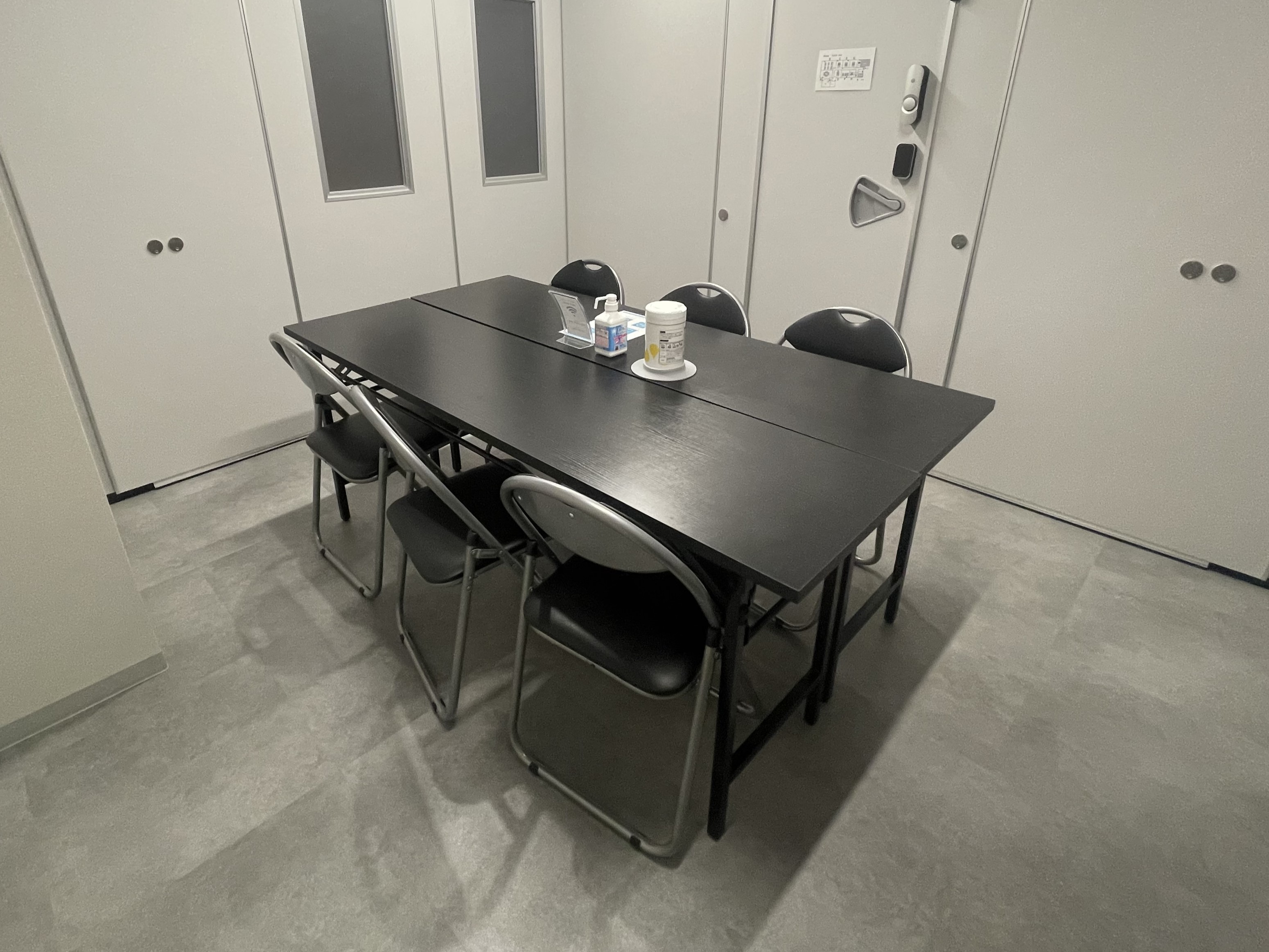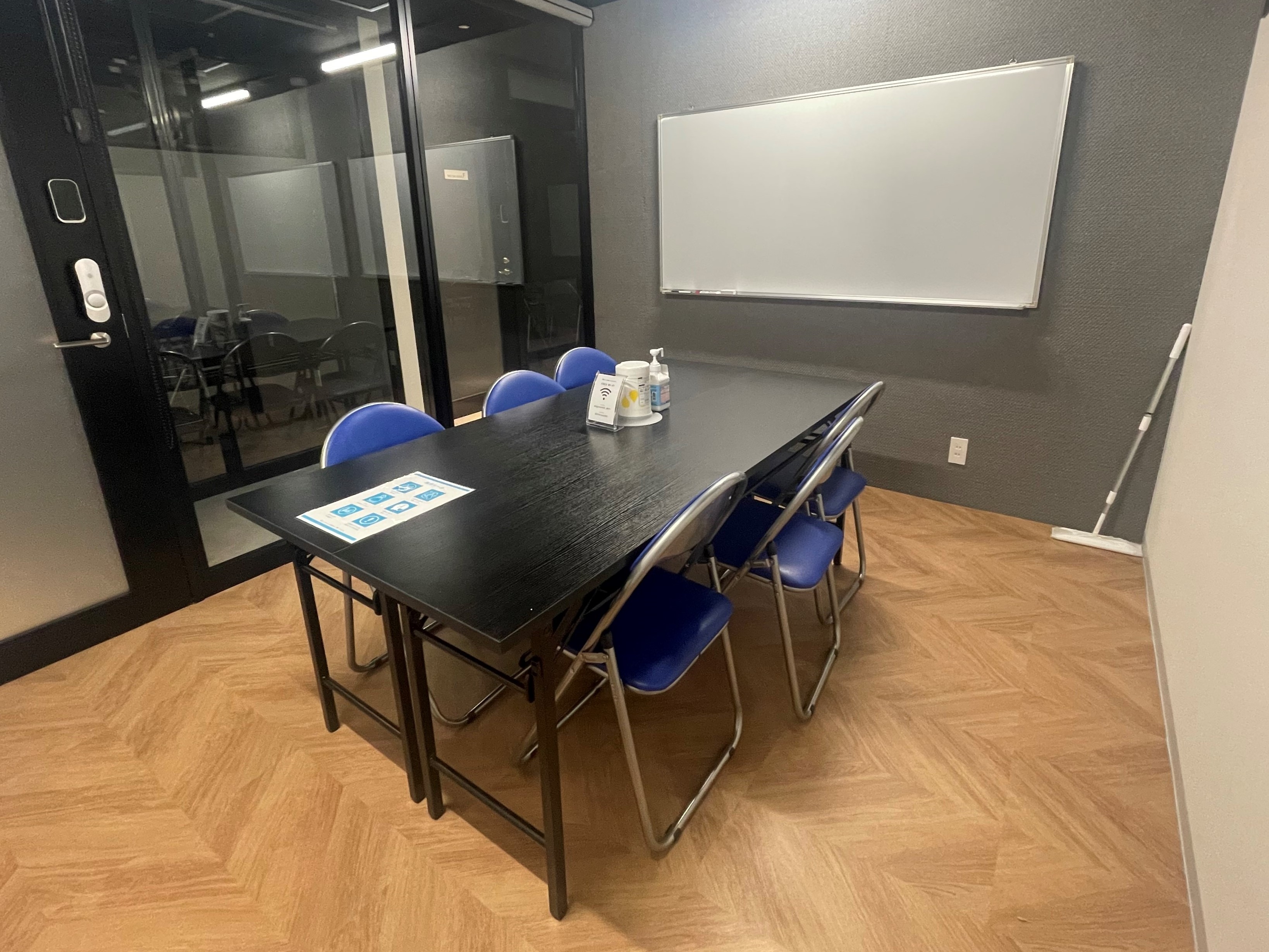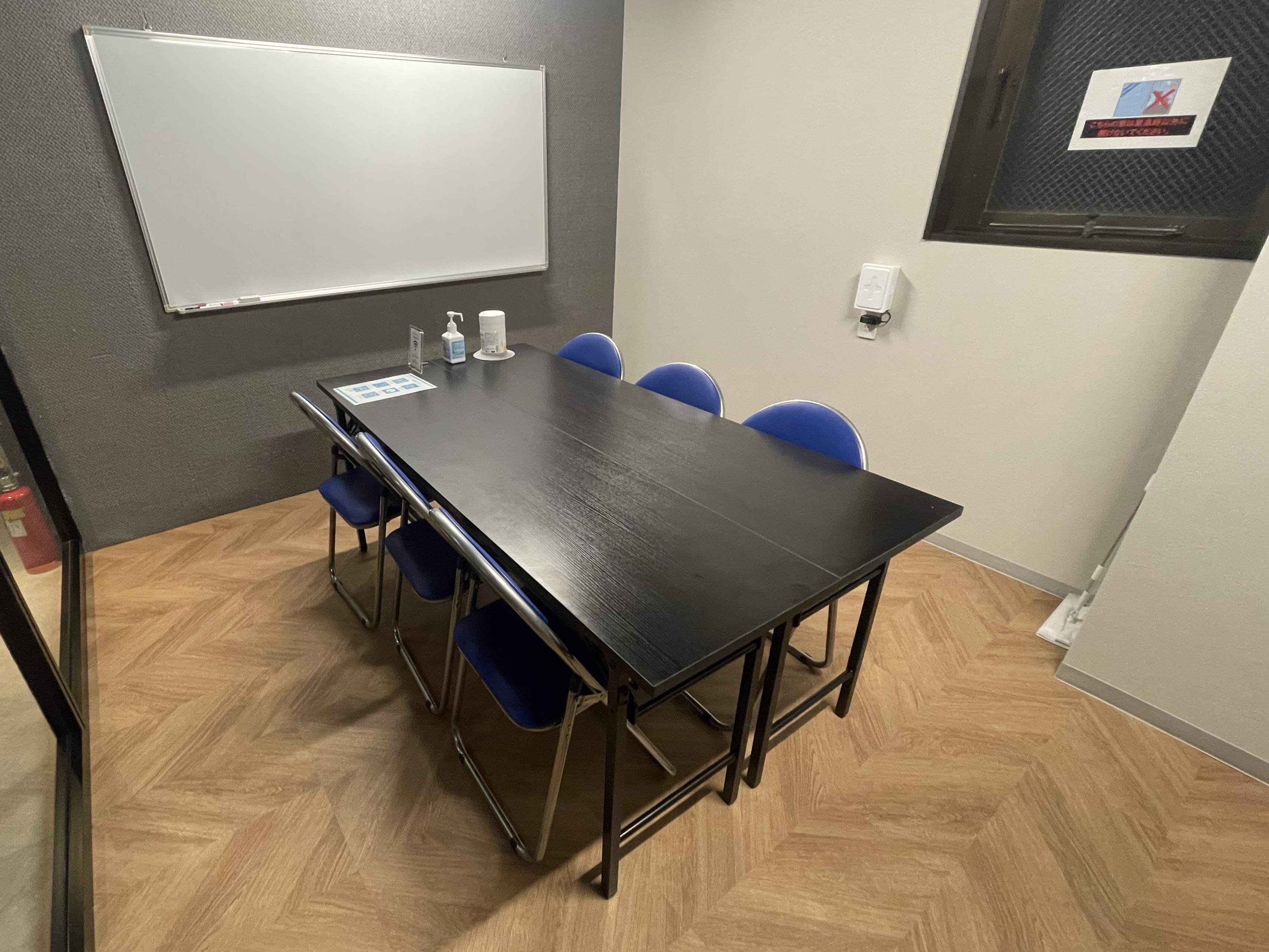 長机2個、椅子6個、ホワイトボード設置。予備椅子あり。